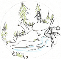 Staurois paces uncomfortably across the porch of the Hylidae raft. Smilisca sits on a stump that’s been bolted to the deck boards and works on tying a complicated knot in the map braid for the Goldfall River. Acris watches his master’s hands intently from where he sits at his feet, practicing his own knots by tying them in fishing line next to Eina with her feet dangling in the cool clear water. Litoria stands in the shallow water next to the raft, leaning gently on her hippopotamus while she grazes.
