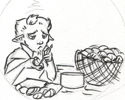 Mental: Eina and Smilisca get to arguing about which would be more useful, a magical way to flesh out horribly undetailed maps, or a magical way to predict the weather. Smilisca goes to find Acris to break the tie, but the apprentice is hip-deep in the shells of last night’s oysters, peeling the mother-of-pearl from their insides to keep for material components, and he smells terribly fishy.